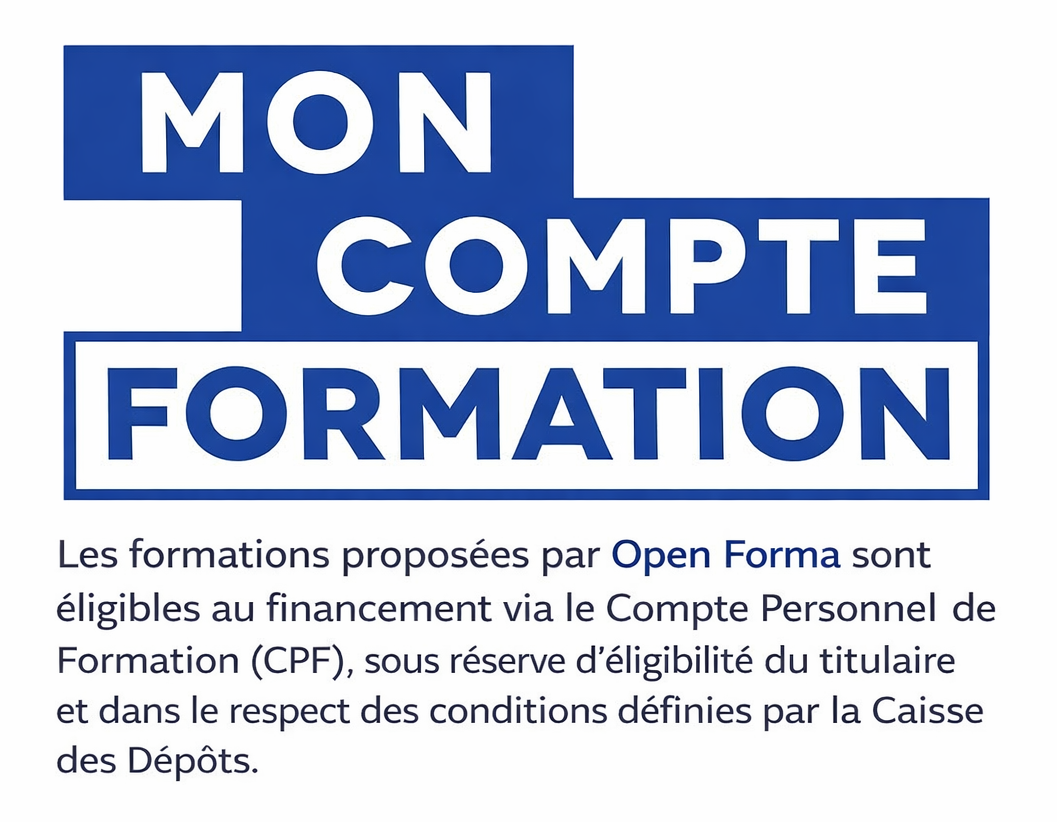 Formations éligibles au financement via le Compte Personnel de Formation (CPF), accessibles depuis votre espace moncompteformation.gouv.fr, dans le respect de la réglementation en vigueur.